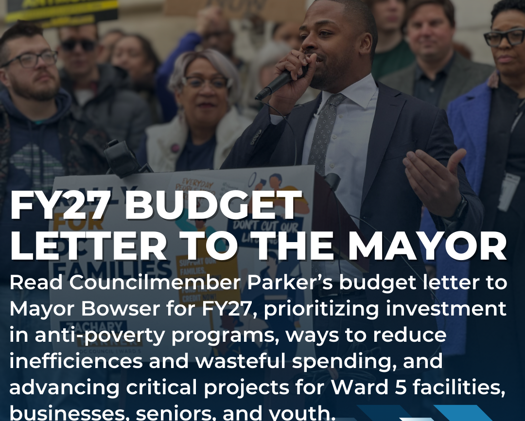 Dear Ward 5 neighbors, After weeks of input from you through the Ward 5 Budget Forum, Ward 5 Budget Survey, and countless conversations and meetings held over several months to discuss the District's budget, I sent my FY27 Budget Letter to Mayor Bowser earlier this week. This letter details the priorities I am eyeing as…