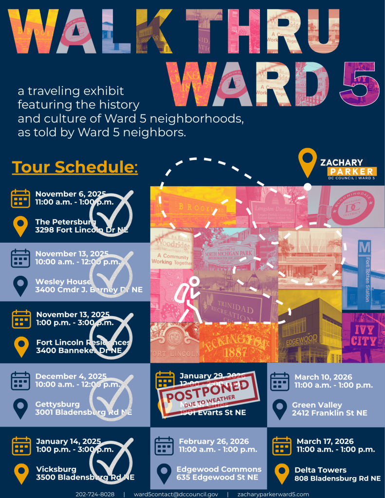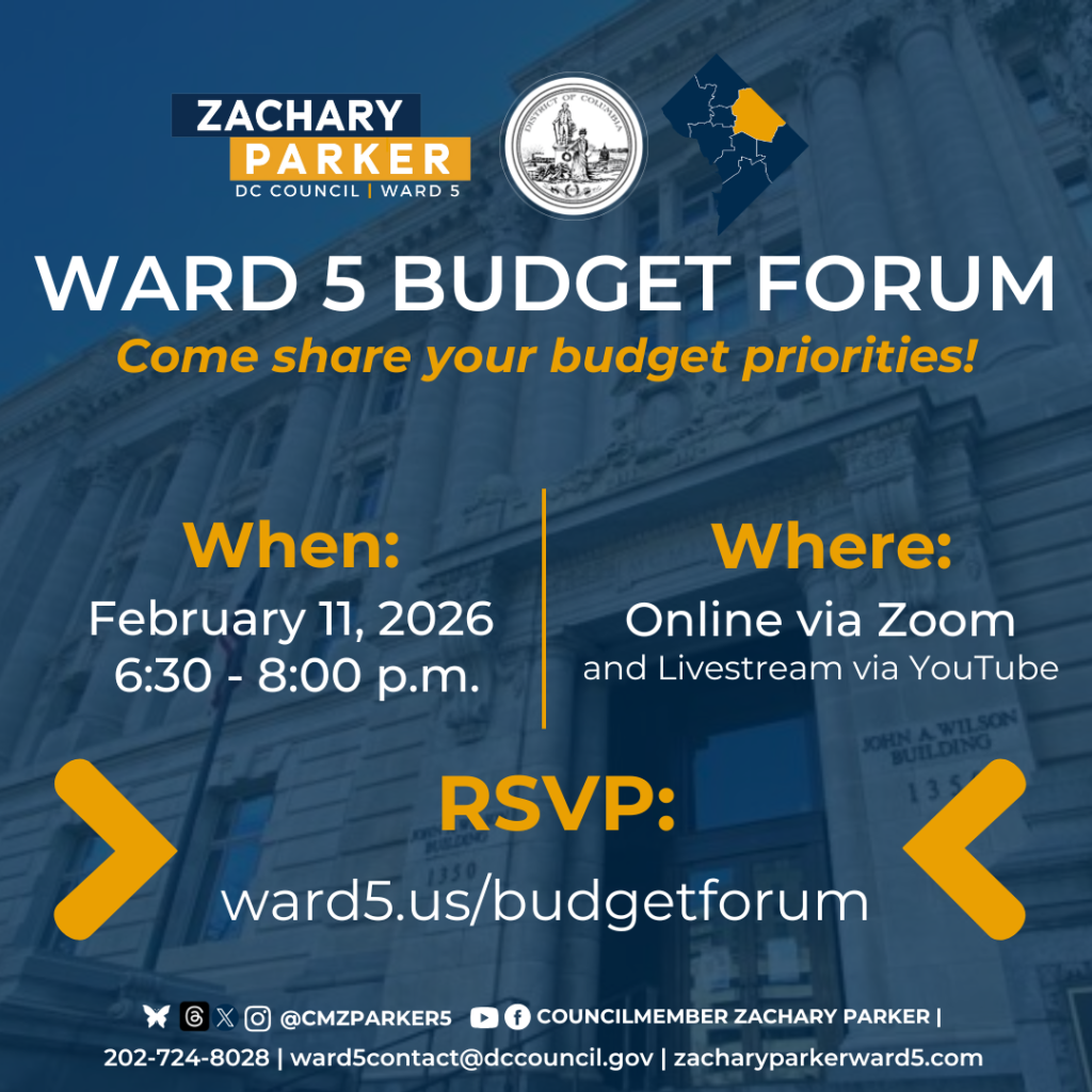 This page features events hosted by Councilmember Parker’s office. For a more general overview of upcoming events in Ward 5 and the District, check out the Team Zachary in the Community section of the most recent edition of the Ward 5 Weekly Newsletter at ward5.us/news.